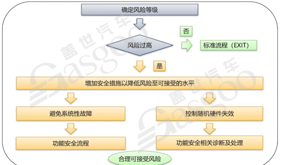 功能安全的方法论是一套工程化思路,旨在实现上述定义的目标。首先确定分析对象的风险等级。若风险过高,则进入功能安全开发体系,增加安全措施以降低风险至可接受水平;若风险处于可接受范围,则按标准流程进行。