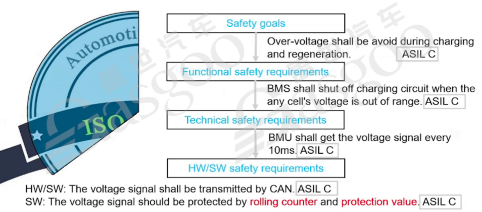 控制随机硬件失效需要具体的方法和设计。以电池管理系统为例,安全目标是在充电和再生过程中避免过压。基于此,衍生出功能安全需求:当检测到任何电池单体电压超出范围时,BMS应切断充电回路。进一步细化为技术安全需求:BMS中的BMU单元应每10ms获取电压信号。再到软硬件安全需求:电压信号通过CAN传输,软件需采用滚动计数器和保护值对电压信号进行保护。不同ASIL等级对故障控制的要求不同,这些安全机制的引入会影响系统、软硬件架构,因此功能安全需尽早介入项目。