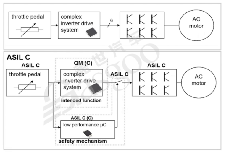 另一个例子是油门踏板控制,为避免无踩踏板时的非预期加速或踩踏板时的异常加速,可采用ASIL分解思路。对于复杂的电驱系统,若直接满足ASIL C代价过高或软件难以修改,可引入低性能芯片,设计安全机制:计算合理的加速比例值,当油门踏板开合度对应的加速超出该比例值时,切断加速输出,使车辆进入不加速的安全状态。这种分解需保证要素的充分独立性,以降低各要素的ASIL等级。