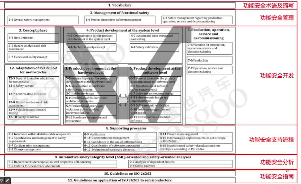 这些部分构成了一个静态架构,其中术语是基础,功能安全管理是核心支撑,产品开发各阶段是主体,支持流程和分析方法是重要保障,指南则提供了实施指导。