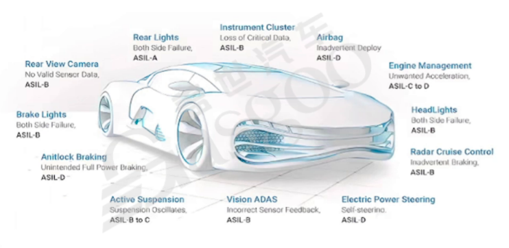 汽车安全完整性等级(Automotive Safety Integrity Level)是其中极为重要的术语,共分为A、B、C、D四个等级,用于表征相关项或要素需要满足的对应等级要求和安全措施,以避免不合理风险。其中,D代表最高严格等级,A代表最低严格等级。不同的汽车功能和系统通常对应不同的ASIL等级,例如安全气囊的误触发可能对应ASIL-D,防抱死制动系统的非预期全功率制动也可能对应ASIL-D,而自适应前照明系统、牵引力控制系统等部分功能可能对应ASIL-B等级。