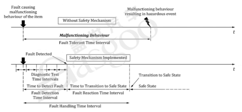 故障容错时间间隔(FTTI,fault tolerant time interval)指在安全机制未被激活情况下,从相关项内部故障发生到可能发生危害事件的最短时间间隔,是安全目标的一个属性,需通过仿真等方式确定,因为实车测试可能存在危险。故障探测时间间隔(FDTI,fault detection time interval)是从故障发生到被探测到的时间间隔。