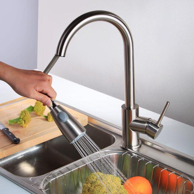 替换方案:抽拉式水龙头。抽拉式水龙头的好处在于它很人性化。因为搭配了一根软管,所以你可以更灵活地掌握水龙头的出水方向,甚至自由切换出水方式是水柱还是花洒,这样一来无论是冲洗碗上的污渍又或者是台盆四周的污渍,都易如反掌。